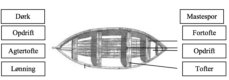 f.eks. tale om fortoften, agtertoften eller mastetoften. Tofterne giver skroget stabilitet og fastholder formen. Jeg sidder normalt på dørken og sjældent på toften. På jollens kølstok står masten i mastesporet eller mastefoden. Meginjollen bør forsynes med opdriftmiddel enten som vist med opdrifttanke af glasfiber i jollens ender eller oppustelige beholdere der er gjort godt fast i jollen. Overkanten af jollens sider kaldes rælingen og det langsgående træ på rælingen kaldes lønningen.